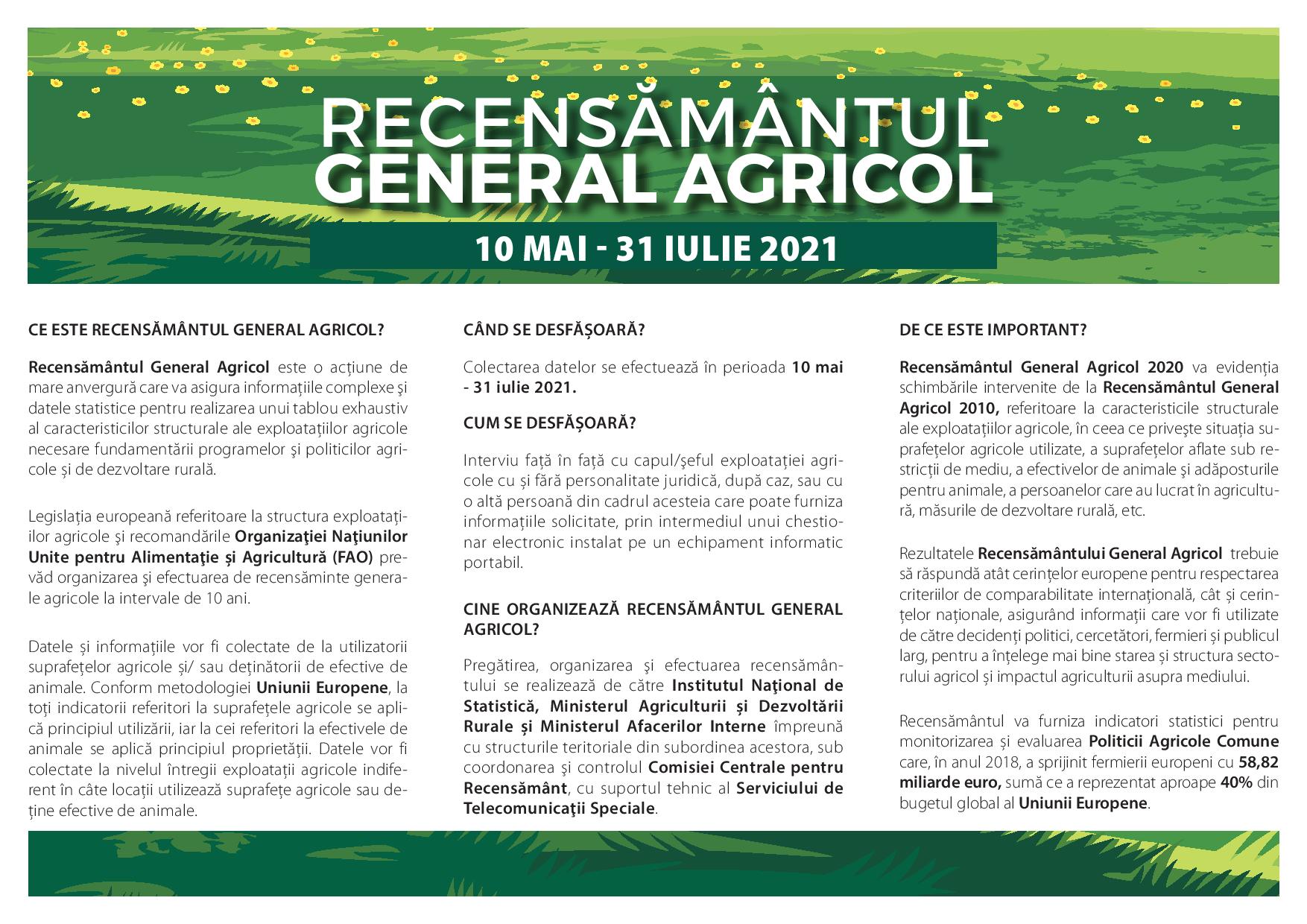 In cazul in care doriti sa aflati mai multe informatii despre Recensământul General Agricol runda 2020 o puteti face accesand pagina dedicata acestuia: https://insse.ro/cms/ro/